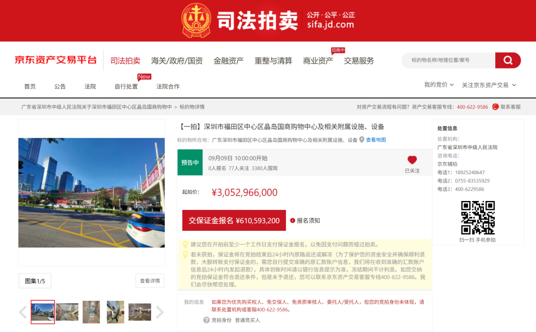 据京东法拍平台,8月7日,广东省深圳市中级东谈主民法院发布对于拍卖深圳市福田区中心区晶岛国商购物中心及计划附庸设施、开拓的公告。公告显现,法院将于9月9日在京东法拍平台上进行公开拍卖举止,起拍价约30.53亿元。